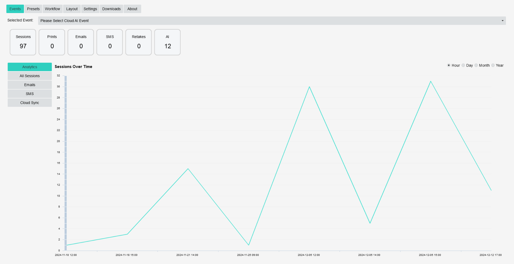 Gain real-time insights into your events with FMBooth’s powerful analytics. Track key metrics like session counts, prints, Email & SMS logs, retakes, and AI usage.